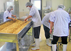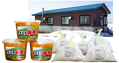 収穫した大豆・毛豆は加工施設で、みそに加工され、とうふは、地元のとうふ加工業者に製造委託して販売しています。また、もち米の製粉受託・もち粉の販売もしています。これらの、加工商品は、JA産直センターでも販売し、味噌の一部は、平川市学校給食センターにも納品しています。味噌の仕込み作業は、11月中旬から翌年の3月中旬まで作業します。